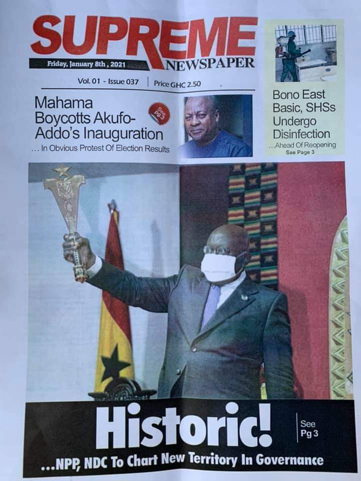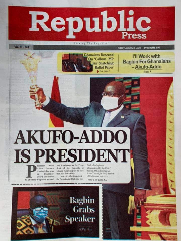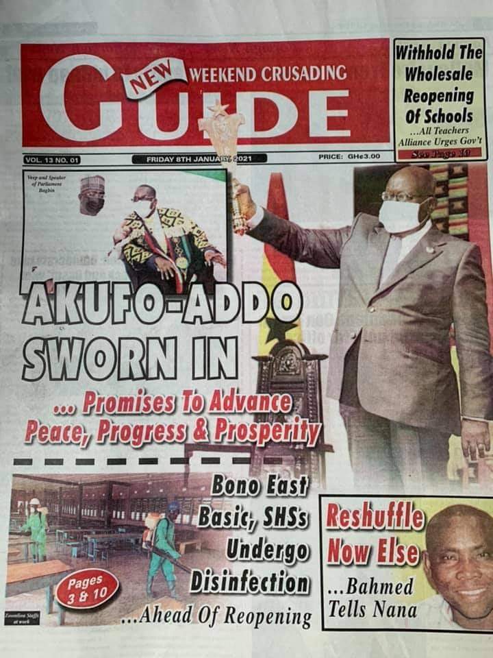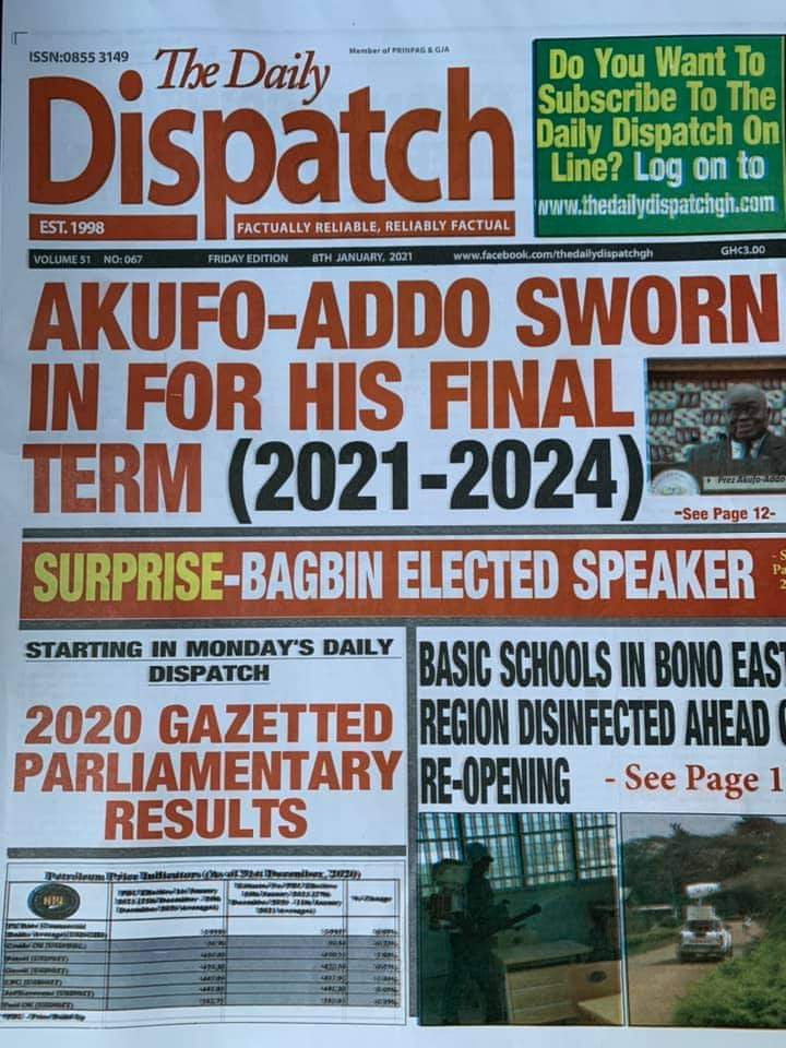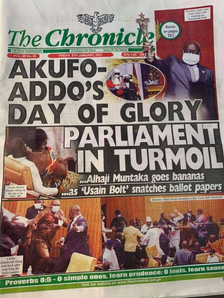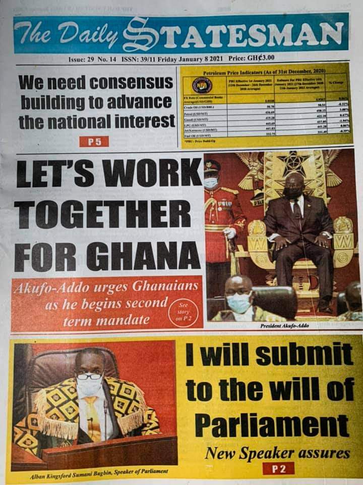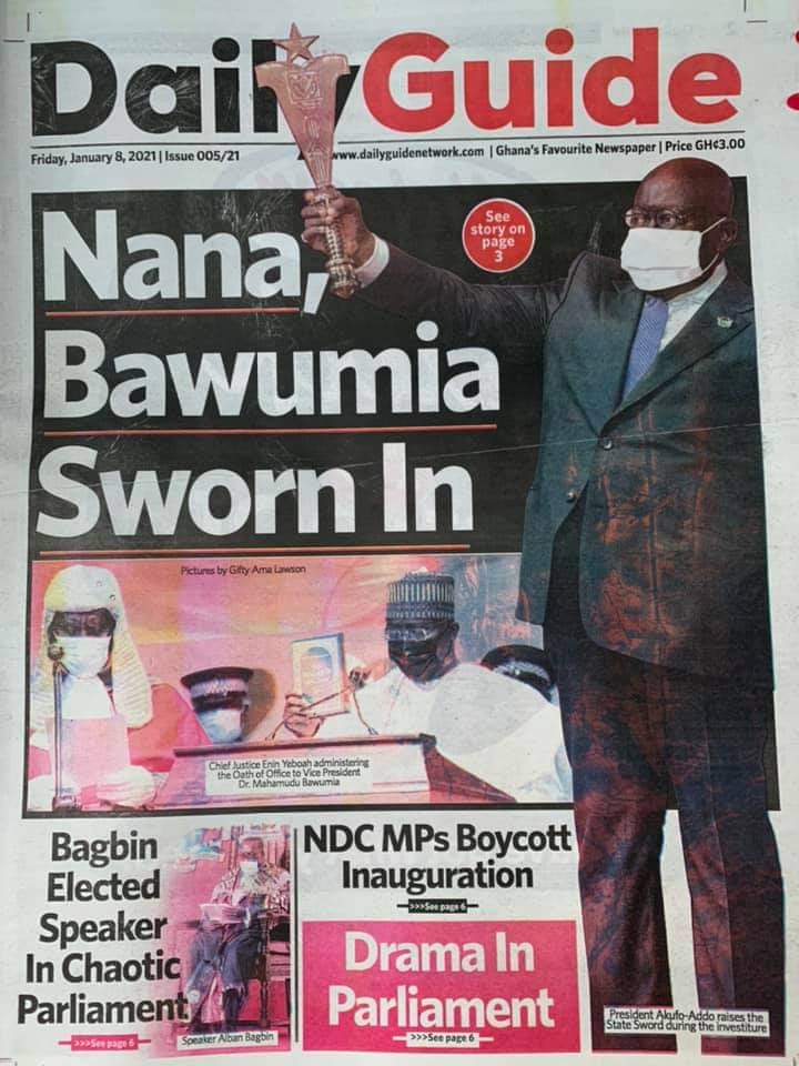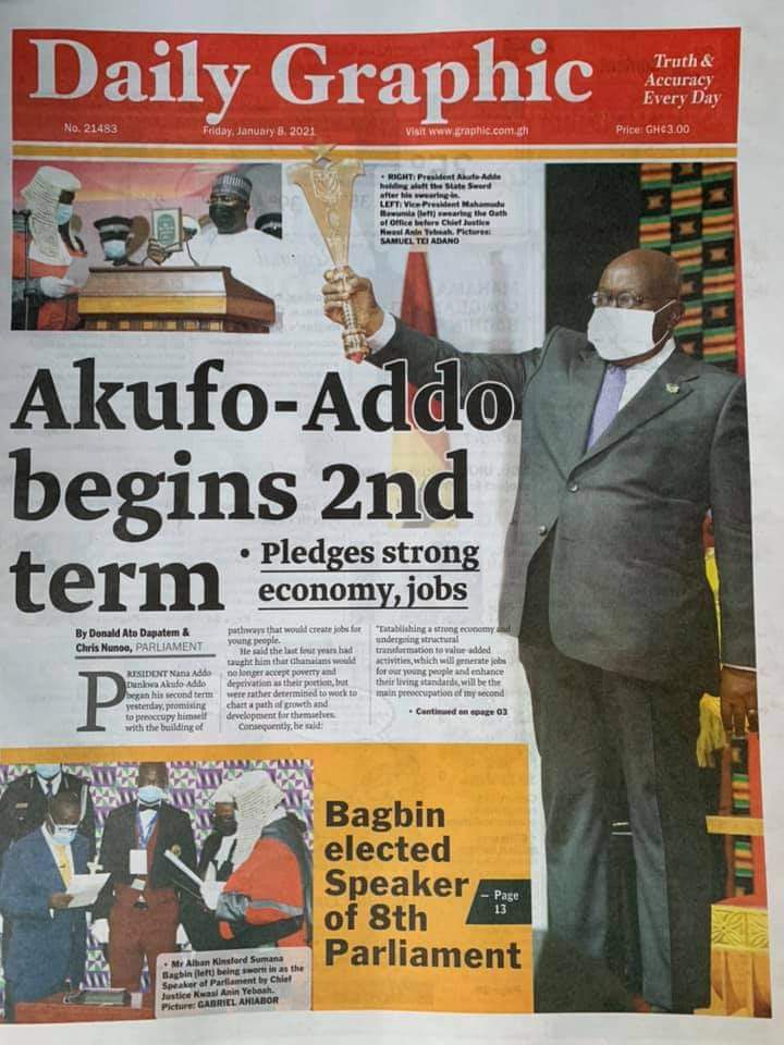Posted in General News Newspaper Headlines: Friday, January 8, 2021 Posted on January 8, 2021 by Kofi Tutu Share this:Share Share on X (Opens in new window) X Share on Facebook (Opens in new window) Facebook Share on Telegram (Opens in new window) Telegram Share on WhatsApp (Opens in new window) WhatsApp Like Loading... Author: Kofi Tutu Kofi Tutu is a Ghanaian Broadcast Journalist/Writer who has an interest in General News, History, Health, Lifestyle and many more.(www.Gnews.com) View All Posts