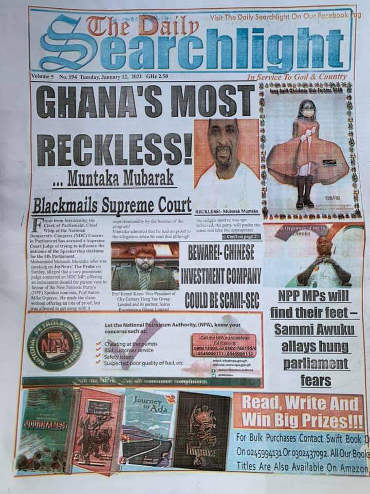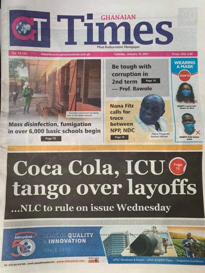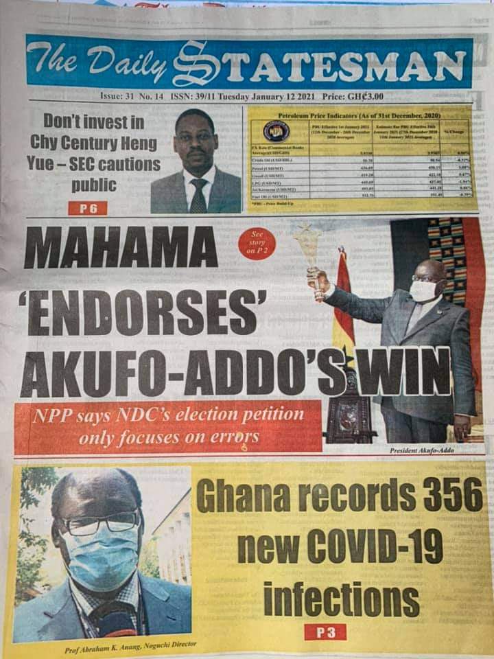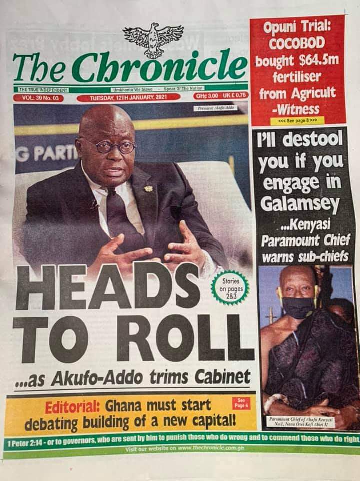Posted in General News Newspaper Headlines: Tuesday, January 12, 2021 Posted on January 12, 2021 by Kofi Tutu Share this:Share Share on X (Opens in new window) X Share on Facebook (Opens in new window) Facebook Share on Telegram (Opens in new window) Telegram Share on WhatsApp (Opens in new window) WhatsApp Like Loading... Author: Kofi Tutu Kofi Tutu is a Ghanaian Broadcast Journalist/Writer who has an interest in General News, History, Health, Lifestyle and many more.(www.Gnews.com) View All Posts