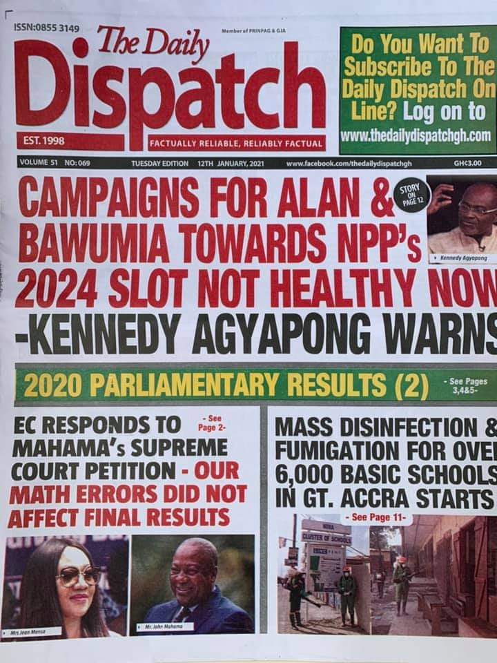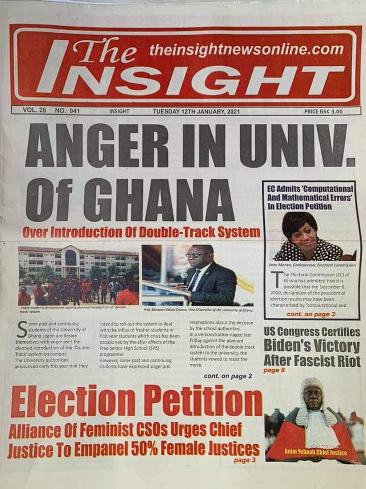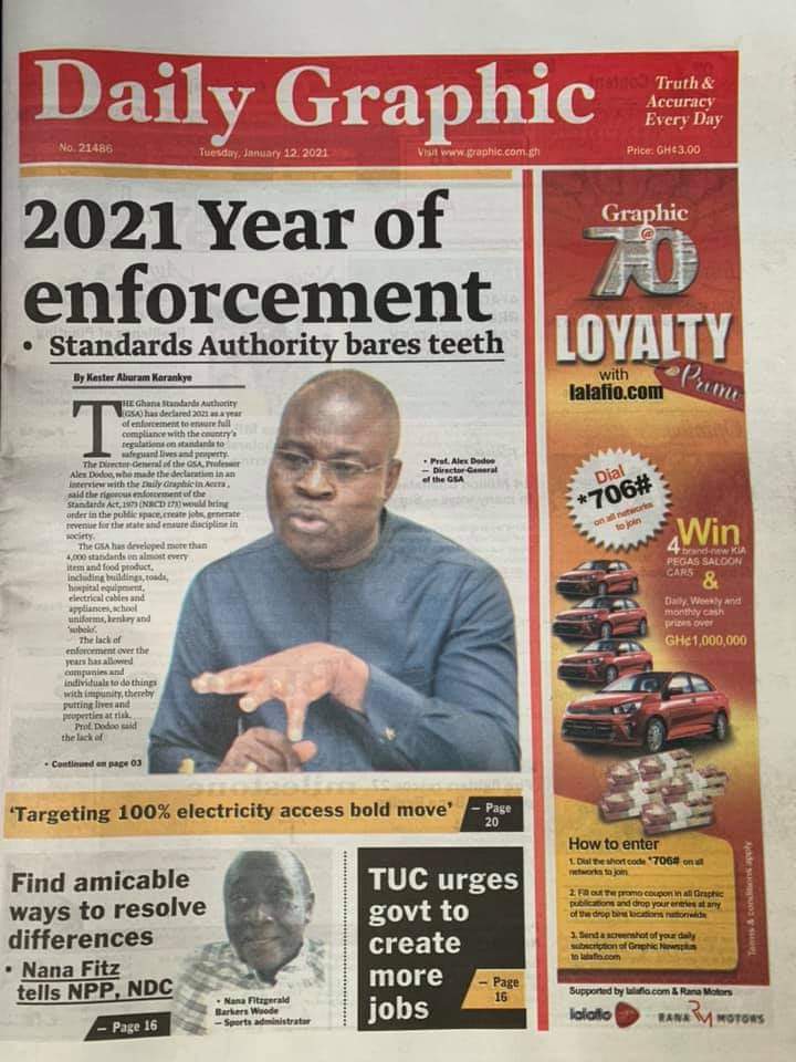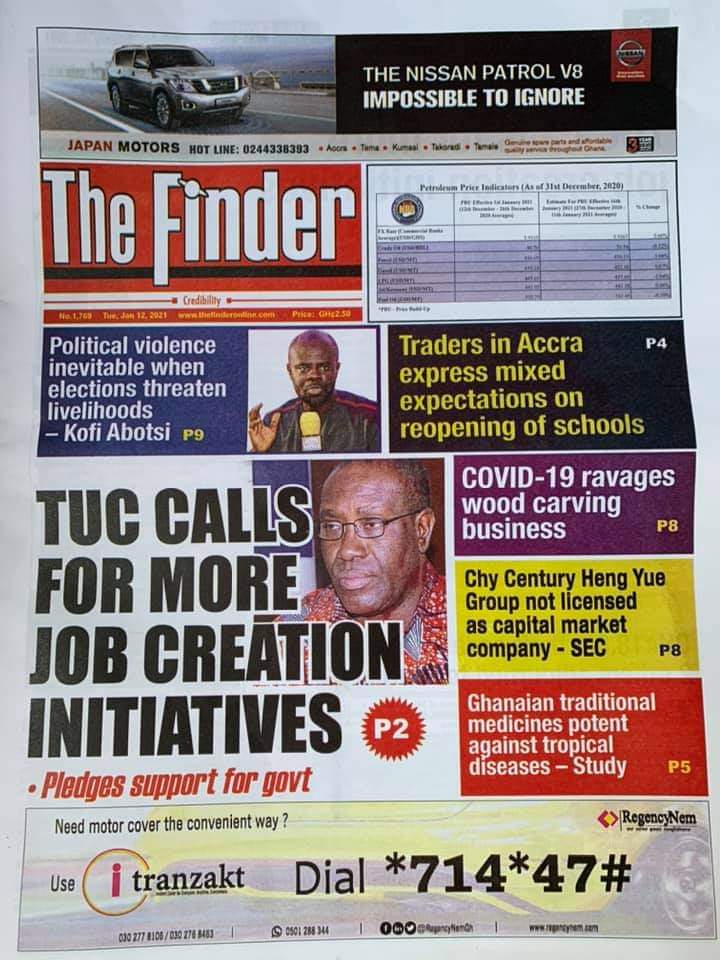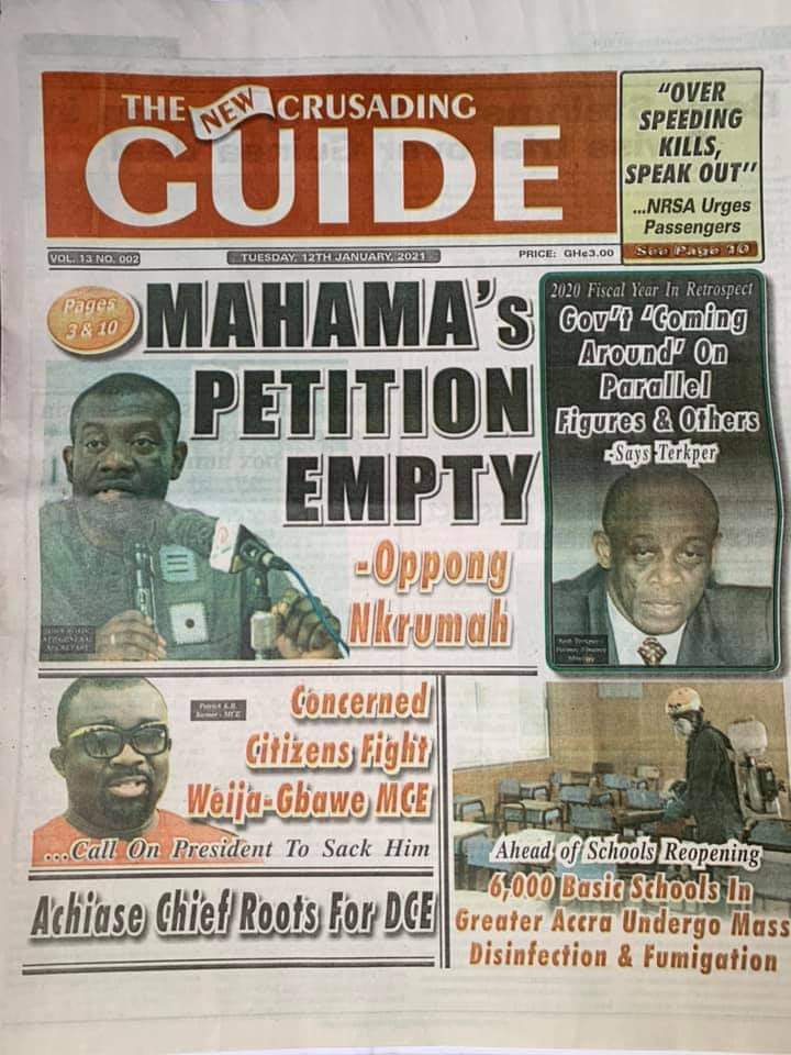 Posted in General News Newspaper Headlines: Tuesday, January 12, 2021 Posted on January 12, 2021 by Kofi Tutu Share this:Share Share on X (Opens in new window) X Share on Facebook (Opens in new window) Facebook Share on Telegram (Opens in new window) Telegram Share on WhatsApp (Opens in new window) WhatsApp Like Loading... Author: Kofi Tutu Kofi Tutu is a Ghanaian Broadcast Journalist/Writer who has an interest in General News, History, Health, Lifestyle and many more.(www.Gnews.com) View All Posts