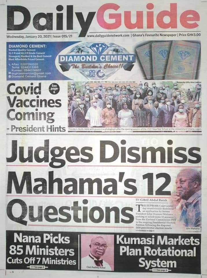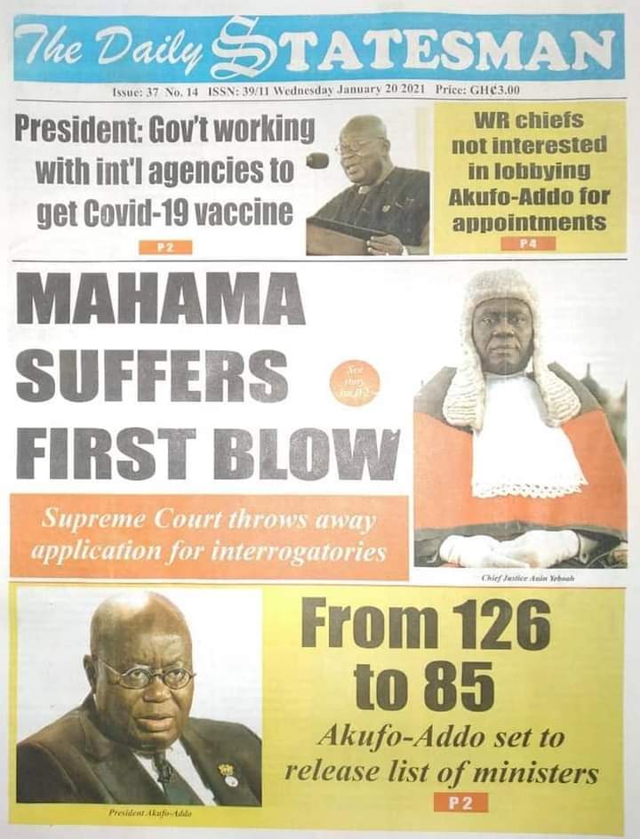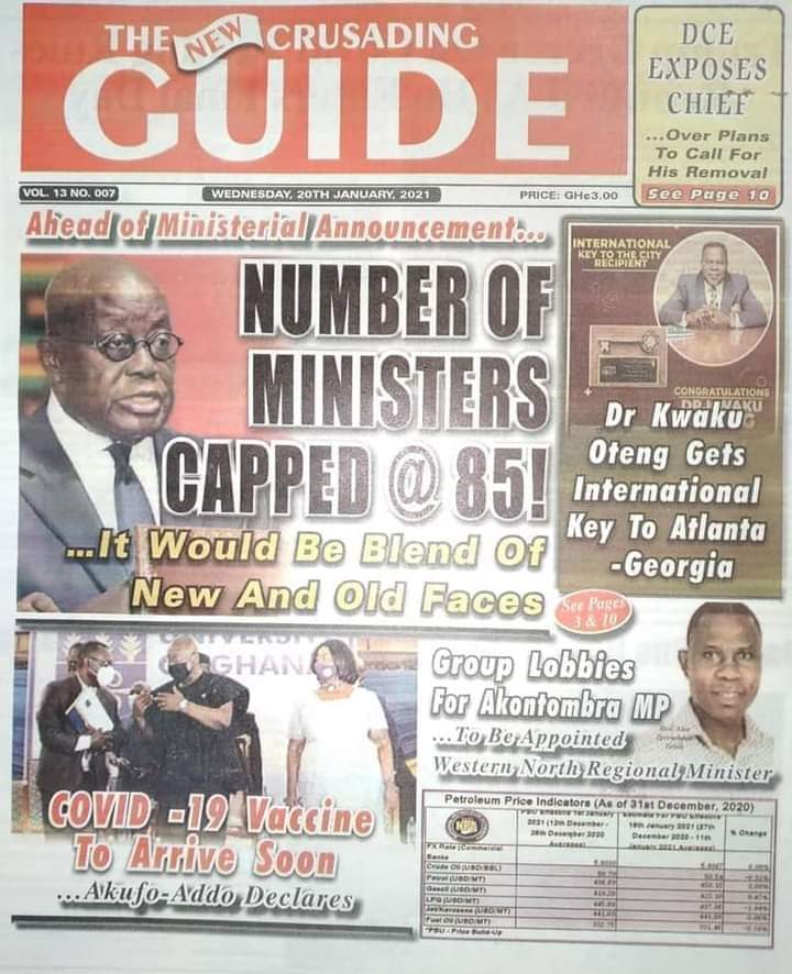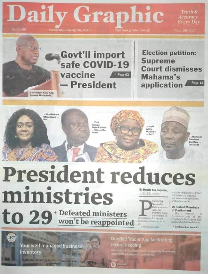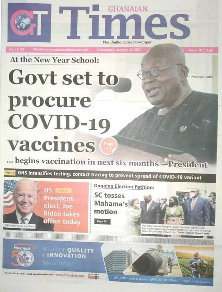 Posted in General News Newspaper Review: Wednesday, January 20, 2021 Posted on January 20, 2021 by Kofi Tutu Source: gnews.com Share this:Share Share on X (Opens in new window) X Share on Facebook (Opens in new window) Facebook Share on Telegram (Opens in new window) Telegram Share on WhatsApp (Opens in new window) WhatsApp Like Loading... Author: Kofi Tutu Kofi Tutu is a Ghanaian Broadcast Journalist/Writer who has an interest in General News, History, Health, Lifestyle and many more.(www.Gnews.com) View All Posts