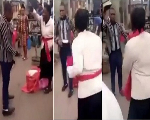 In a video that has since gone viral, the female preacher could be seen charging at the male preacher and hurling abuses at him while the man was firing hot ”prayers” against her.